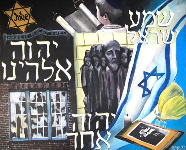 During her time at the KU, Kricsfeld worked on a piece of art called “Never Again.” She said, “[it] depicts the Jewish journey from the Holocaust to present day.” Originally, Kricsfeld started this piece in high school as a social issue project because she wanted to speak out for Israel, as she was one of the few Jews in her public high school. Kricsfeld depicts antisemitism with compelling imagery from the Holocaust. For example, she painted the sign in front of Auschwitz, the broken glass of Kristallnacht, and Shabbat candles. She explains that the Shabbat candles illustrate that the Jewish faith is still strong, which is important when depicting Jewry throughout tough times. After reading the Torah portion one year, Kricsfeld was also inspired to make seven different paintings depicting the seven days of creation.