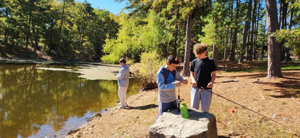This week HBHA’s 8th graders took a four-day camping trip to Southern Missouri accompanied by three faculty members. During this trip they spent time at Twin Pines Conservation Area, where they learned about wildlife. Photographed above is Amos W., Jonah S., and Sammy H., attempting to catch their dinner for the day. Photo courtesy of Valerie Freeman.